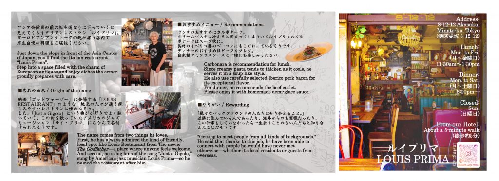 Just walk down the slope in front of our hotel and follow the road, and you will come across the restaurant "Louis Prima".